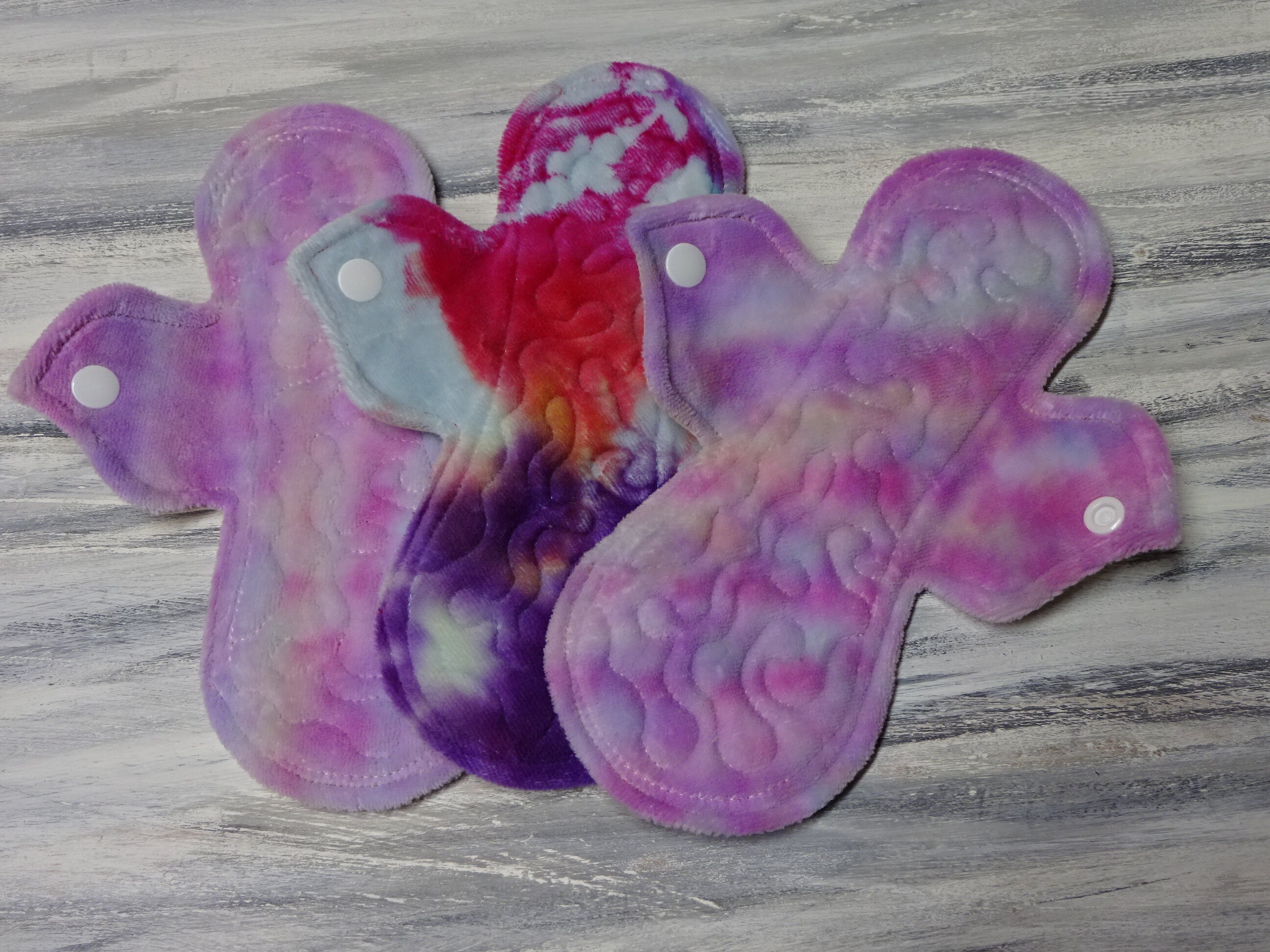 10 inch and 12 inch pads are shown in the photos in rainbow Bamboo cotton velour and 2 of the 10 inch pads are shown tiedye bamboo cotton velour.